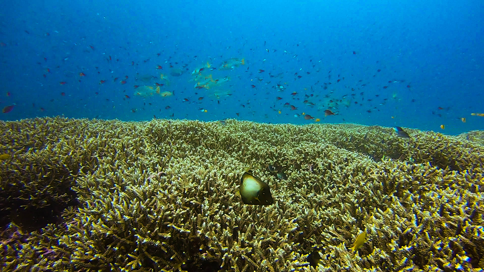 It continues by sloping down and at the curvature of the bay we have a vertical coral wall.